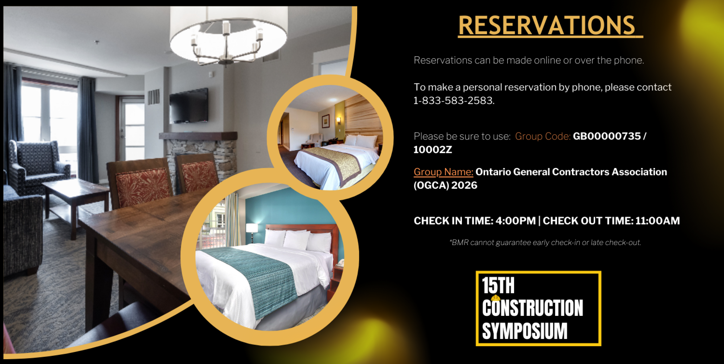 To make a personal reservation by phone, please contact 1-833-583-2583. Please be sure to have the group code (GB00000735 / 10002Z ) and group name Ontario General Contractors Association (OGCA) 2026 ready. Provide your group code and group name.